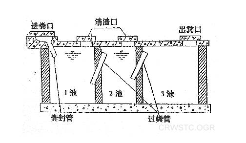 新鮮糞便由進(jìn)糞口進(jìn)入第一池,池內(nèi)糞便開始發(fā)酵分解、因比重不同糞液可自然分為三層,上層為糊狀糞皮,下層為塊狀或顆狀糞渣,中層為比較澄清的糞液。在上層糞皮和下層糞渣中含細(xì)菌和寄生蟲卵最多,中層含蟲卵最少,初步發(fā)酵的中層糞液經(jīng)過糞管溢流至第二池,而將大部分未經(jīng)充分發(fā)酵的糞皮和糞渣阻留在第一池內(nèi)繼續(xù)發(fā)酵。流入第二池的糞液進(jìn)一步發(fā)酵分解,蟲卵繼續(xù)下沉,病原體逐漸死亡,糞液得到進(jìn)一步無害化,產(chǎn)生的糞皮和糞厚度比第一池顯著減少。流人第三池的糞液一般已經(jīng)腐熟,其中病菌和寄生蟲卵已基本殺滅。第三池功能主要起儲存已基本無害化的糞液作用。的作用